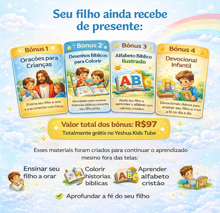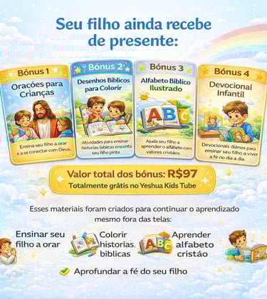 Ao garantir o acesso do YESHUA KIDS TUBE hoje, você também libera materiais exclusivos para fortalecer a fé do seu filho todos os dias